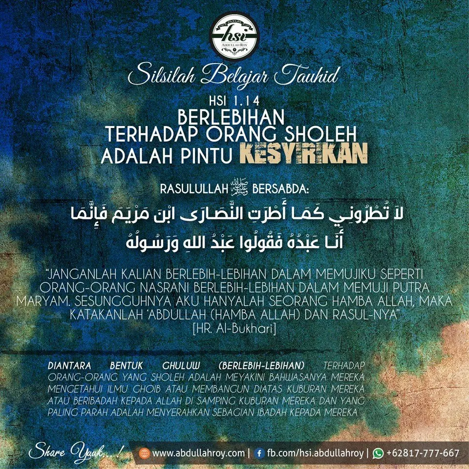 Janganlah kalian berlebih-lebihan terhadapku, sebagaimana orang-orang nasrani berlebih-lebihan terhadap ‘Isa ibnu Maryam. Sesungguhnya aku adalah hambaNya, maka katakanlah hamba Allâh dan RasulNya (HR. Al-Bukhori)