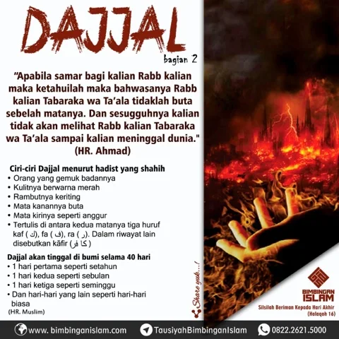 Dajjal akan tinggal di bumi selama 40 hari, satu hari pertama seperti satu tahun, satu hari kedua seperti sebulan, satu hari ketiga seperti seminggu dan hari-hari yang lain seperti hari-hari biasa (HR. Muslim)