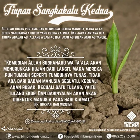 Setelah tiupan yang pertama dan meninggal semua manusia, maka akan ditiup sangkakala untuk yang kedua kalinya. Dan jarak antara dua tiupan adalah 40. Allahu a’lam, apakah 40 hari atau 40 bulan atau 40 tahun. Rasulullah ﷺ bersabda di dalam hadits Abu Hurairah: