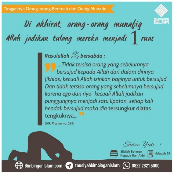 “Tidak tersisa orang yang dahulu sujud untuk Allāh , ikhlās dari dirinya kecuali Allāh akan mengijinkan dia bersujud. Kemudian tidaklah tersisa orang yang dahulu sujud karena hanya ingin melindungi diri dan riya’ kecuali Allāh akan menjadikan punggungnya menjadi rata.
