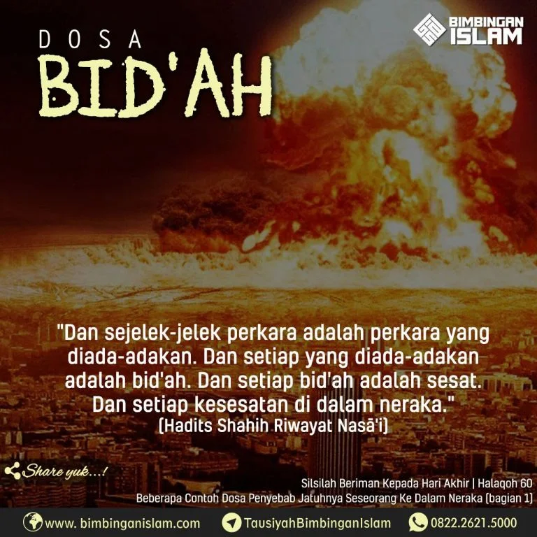 “Dan sejelek-jelek perkara adalah perkara yang diada-adakan. Dan setiap yang diada-adakan adalah bid’ah. Dan setiap bid’ah adalah sesat. Dan setiap kesesatan di dalam neraka. ”